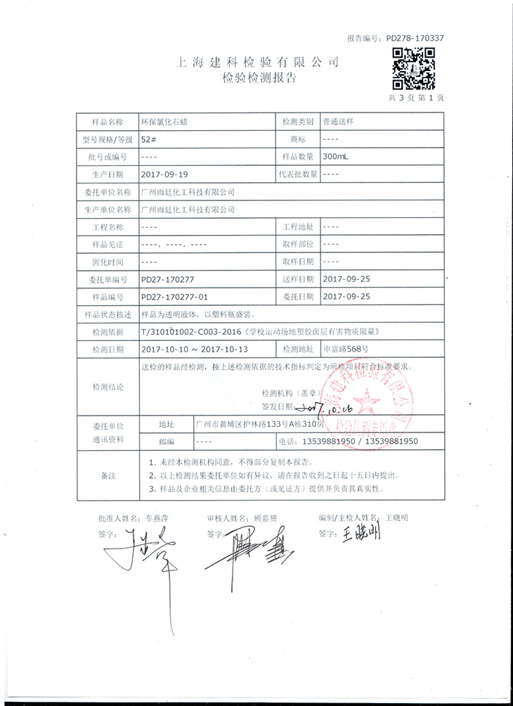 環(huán)保氯化石蠟 附上海建科檢驗檢測報告